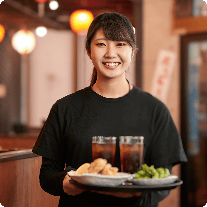 まず、お客様が来店し、空席の状況確認の場面でインカム(無線機)が活躍します。また、席の準備が整ったらすぐにインカム(無線機)で報告することにより、店頭で待っているお客様を効率的にご案内できます。