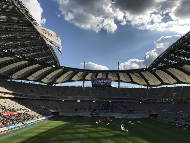 大勢の人が集まるスタジアムでは、熱狂するサポーターの声援で音が聞き取りづらい環境ですが、インカムを活用することでスムーズに連絡をとりあうことができます。